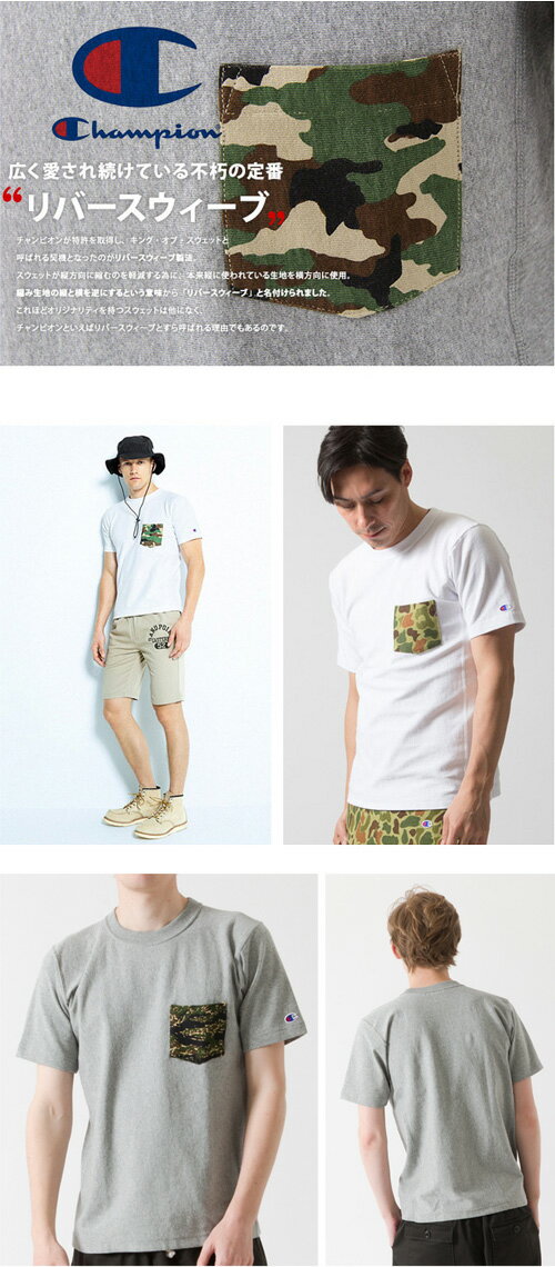 ギフト対応 Champion(チャンピオン) REVERSE WEAVE カモポケットTシャツ 1938年にChampionが特許を取得し、キングオブスウェットと 呼ばれる契機となった リバースウィーブ製法でつくられた ポケットTシャツ。