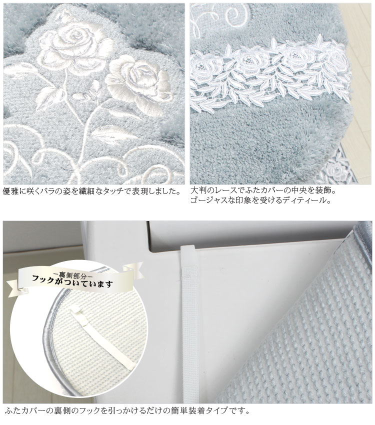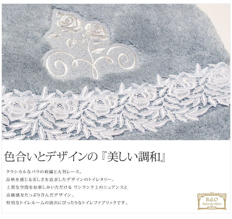 素材 本体部分:アクリル60% レーヨン40% レース部分:レーヨン100% 生産国 日本製 特徴 美しいバラの刺繍と大判レースが高級感あふれるデザイン 強い色でも、柄でもありませんが ゴージャスなニュアンスが印象に残る エレガントな雰囲気を楽しめるトイレタリーシリーズです。
