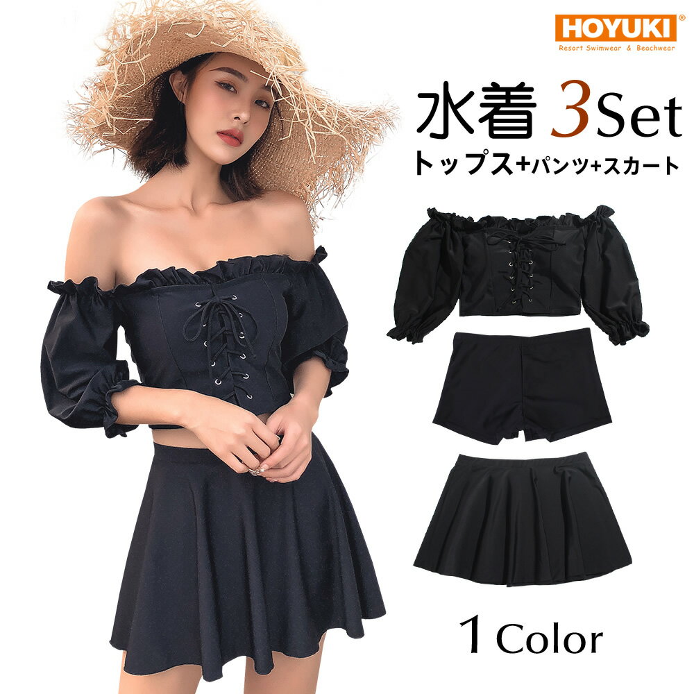 水着 レディース 体型カバー 3点セット ビキニ オフショルダー 大きいサイズ セクシー ブラック 無地 オトナ女子 M/L/LL
